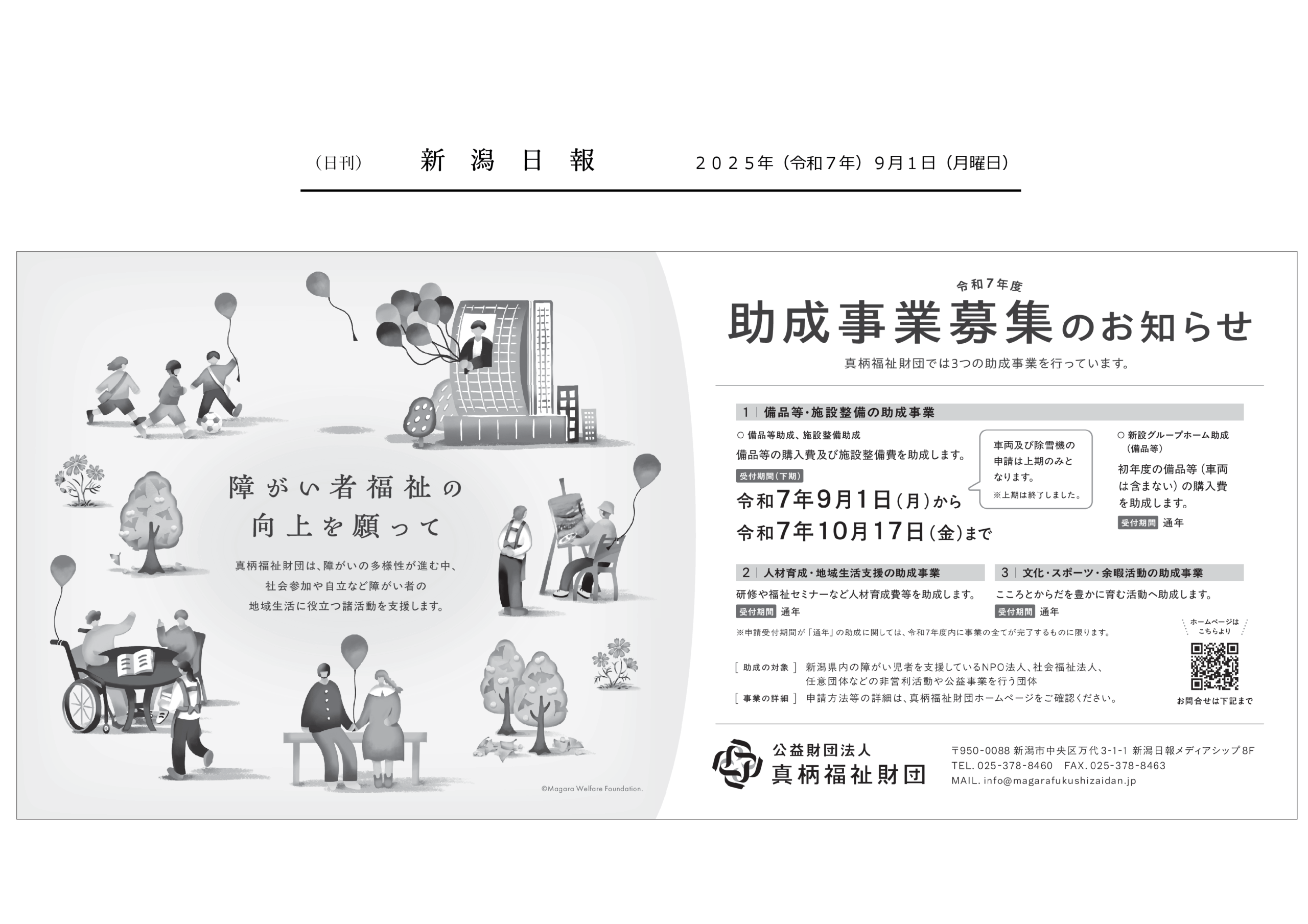 新潟日報朝刊に「令和7年度助成事業募集のお知らせ」を掲載しました。